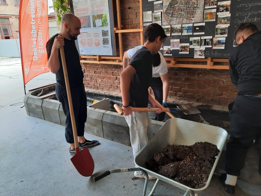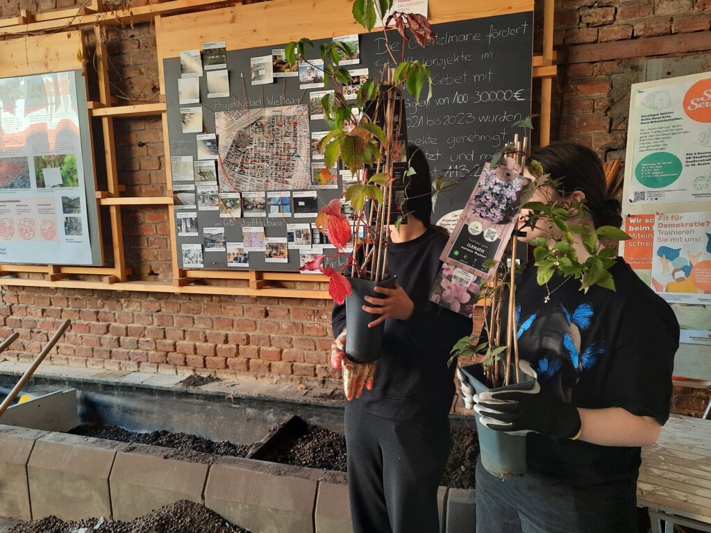 Es wurden Fragen zu Begrünung in der Stadt und Gebäudebegrünung besprochen, Begrünungselemente gebaut (Stahltröge, Holztröge) und bepflanzt.