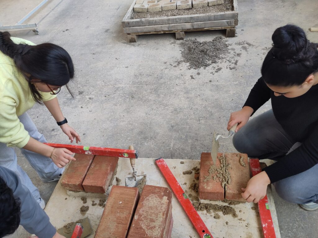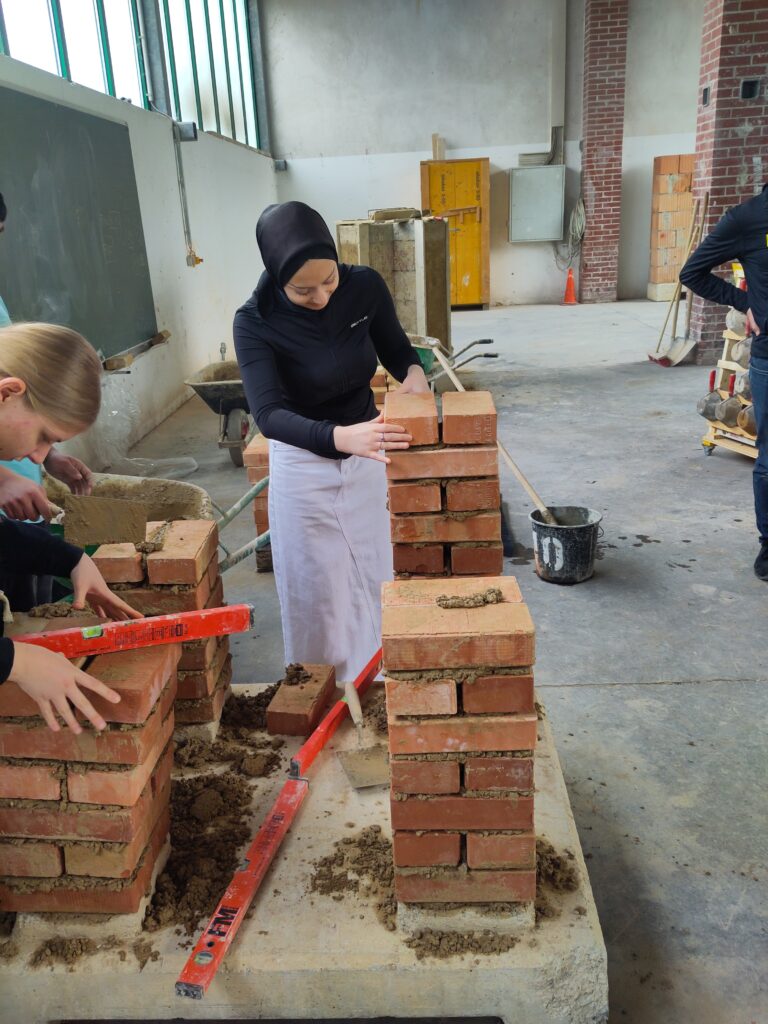 Schüler:innen des Fachbereichs Bau/Holz der Dienstag und Donnerstagsgruppe konnten an zwei Vormittagen praktischen Einblick in die Berufe des Bauhauptgewerbes (Hochbau, Tiefbau, Betonbau, Pflasterer:innen) bekommen. Es wurde gemauert, grob verputzt und Pflastersteine verlegt!